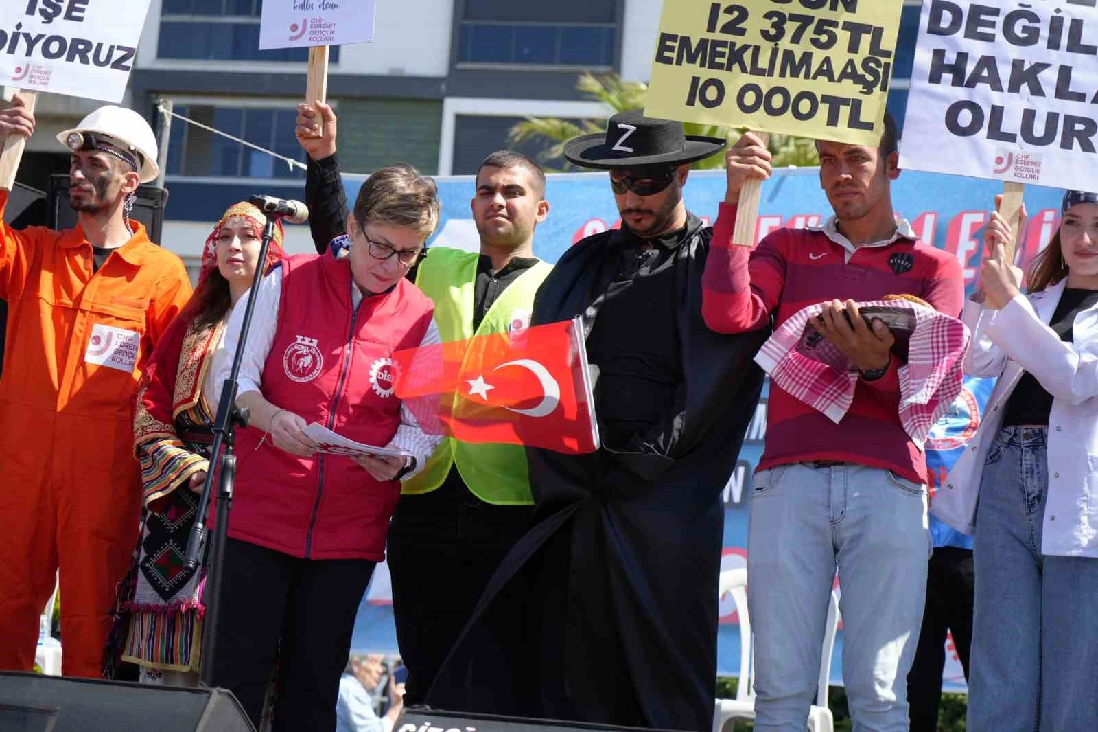 Balıesir'in Edremit ilçesinde 1 Mayıs Emek ve Dayanışma Günü düzenlenen kortej yürüyüşü ve mitingle birlikte coşkuyla kutlandı. Edremit'teki kutlamalara tiyatro oyuncusu Umut Durmaz Zoro kıyafeti ile katılarak dikkatleri çekti.