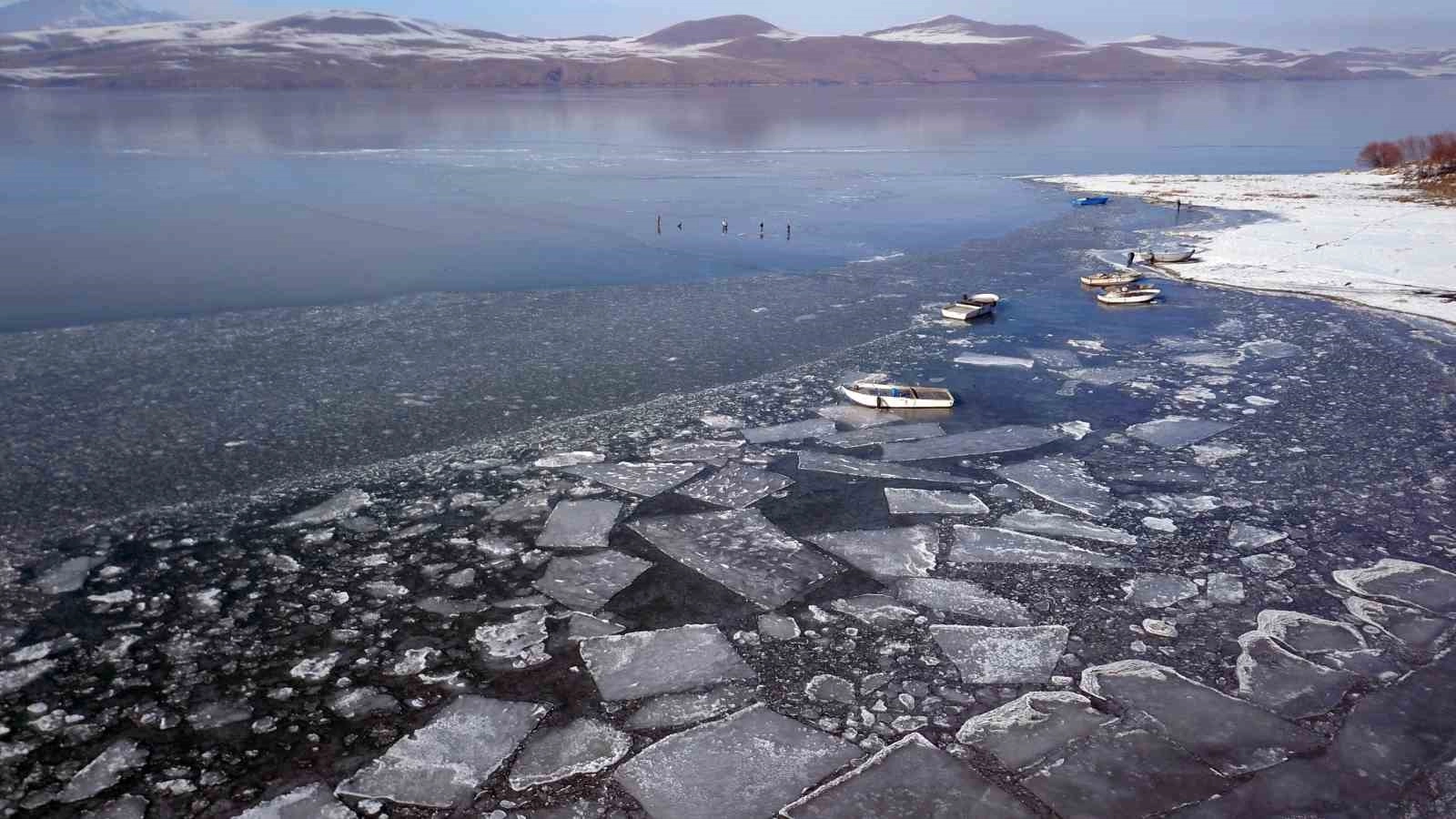 Bitlis'in Ahlat ilçesinde soğuklar nedeniyle yüzeyi tamamen buzla kaplanan Nazik Gölü havadan görüntülendi.