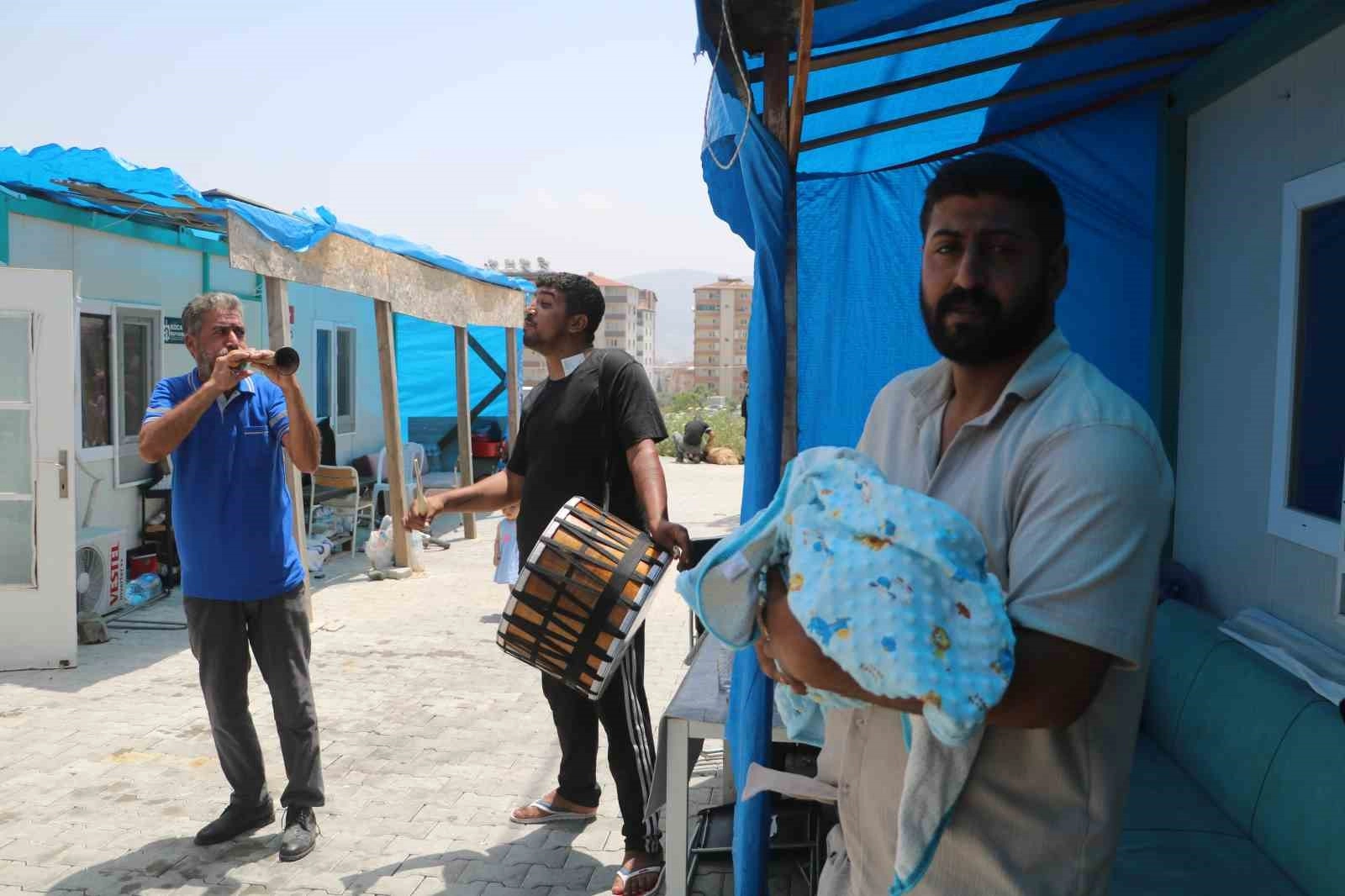 Hatay'da 5 kız torunun ardından 15 yıl sonra dünyaya gelen erkek torun, Özkan ailesi tarafından davul ve zurnayla karşılandı. Renkli görüntülerin oluştuğu konteyner kentte bir nebzede olsa insanların yüzleri gülümsedi.
