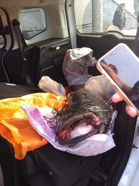 Tepetarla Mahallesi'nden geçen Sakarya Nehri'nde amatör balıkçıların oltasına yaklaşık 2 metre boyunda ve 75 kilogram ağırlığında yayın balığı takıldı. Gördükleri manzara karşısında hayrete düşen balıkçılar, dev balığı güçlükle kıyıya çıkardı. Kantarda ağırlık ölçümü yapılan balık, hafif ticari aracın arka koltukları yatırılarak bagaja sığdırıldı. Balıkçıların hem nehirde hem de karada yaşadıkları zorlu anlar ise saniye saniye cep telefonu kamerasıyla kaydedildi.
