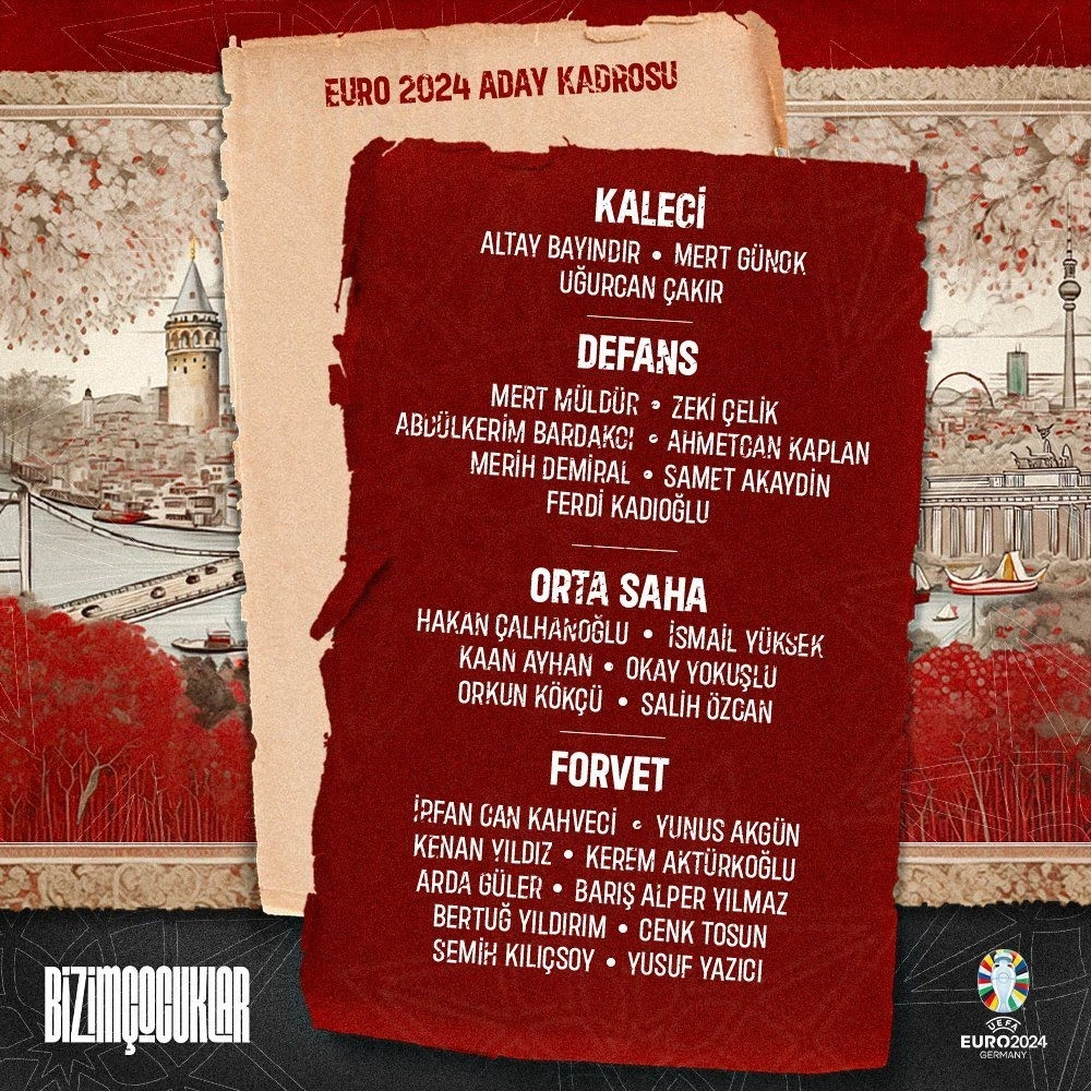 Almanya'da düzenlenecek 2024 Avrupa Futbol Şampiyonası'nda (EURO 2024) mücadele edecek A Milli Futbol Takımı'nın 26 kişilik nihai kadrosu açıklandı.