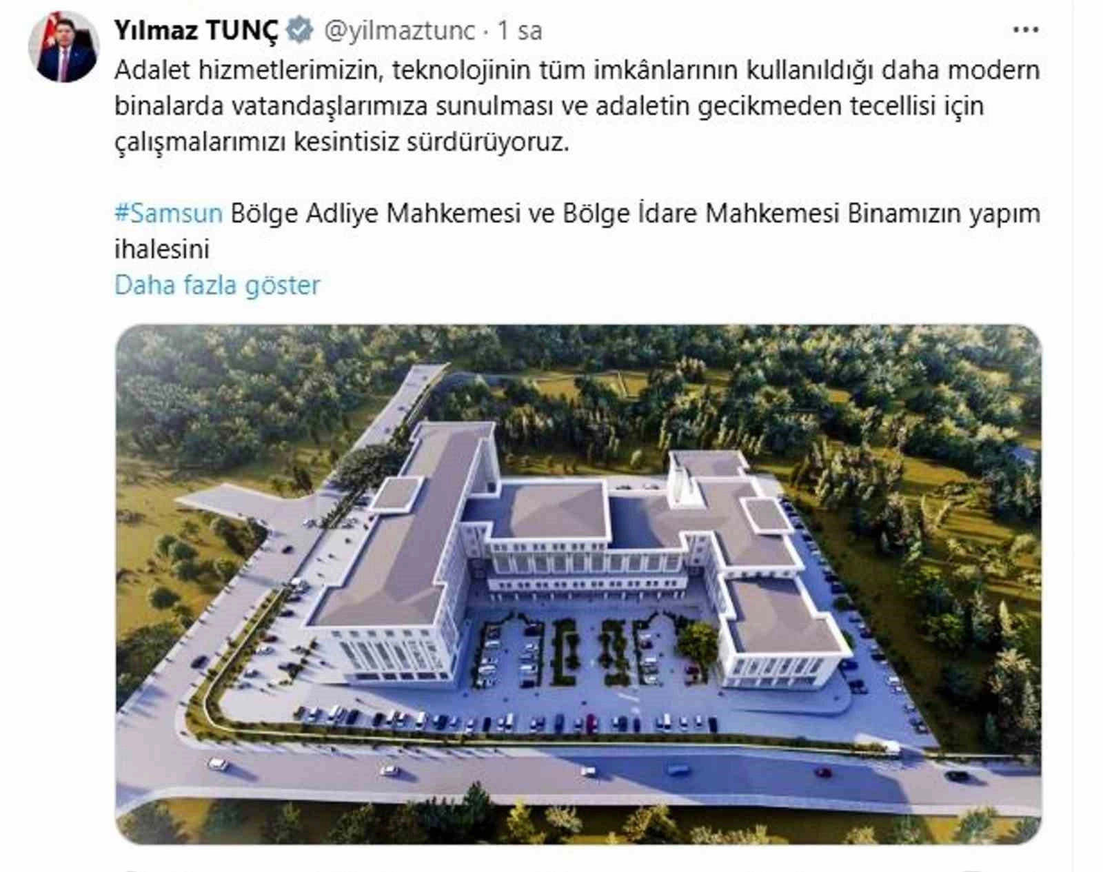 "Samsun Bölge Adliye Mahkemesi ve Bölge İdare Mahkemesi Binamızın yapım ihalesini yarın gerçekleştireceğiz. Samsun Bölge Adliye Mahkemesi ve Bölge İdare Mahkemesi Binamız 43 bin 334 m2 inşaat alanı, 2 bodrum, zemin ve 5 kat, 279 hâkim ve savcı odası, 23 duruşma salonu, 250 kişilik toplantı ve konferans salonu, toplam 478 araçlık otoparktan oluşacak. Bölge Adliye Mahkemesi ve Bölge İdare Mahkemesi Binamızın şimdiden hayırlı olmasını diliyorum."