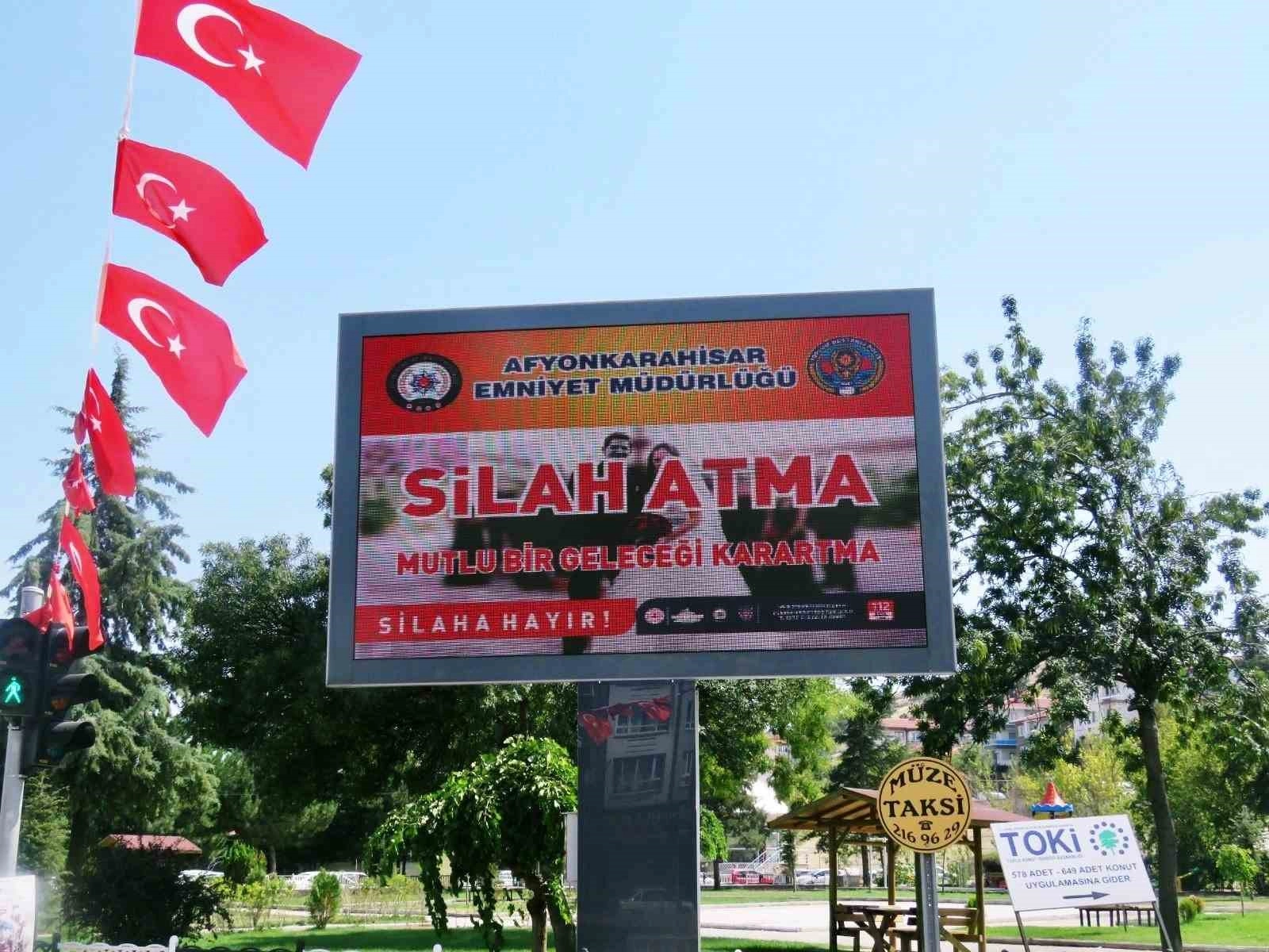 Afyonkarahisar İl Emniyet Müdürlüğü, düğün, sünnet gibi eğlencelerde silah atılmaması yönünde çeşitli uyarılarına devam ediyor. Bu çerçevede yapılan denetimlerin yan sıra hazırlanan afişler de çeşitli noktalarında yer alan elektronik billboardlarda yayınlanıyor. Afyonkarahisar Emniyet Müdürlüğü sosyal medya hesabından yapılan açıklamada şu ifadelere yer verildi:
