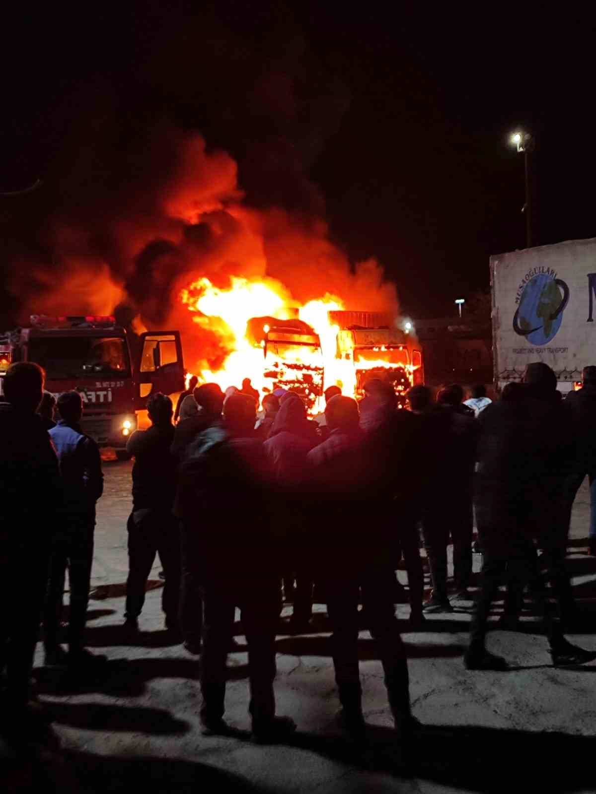 Ağrı'nın Doğubayazıt ilçesinde gümrük sırası beklerken araç içindeki ısıtıcıların patladığı iki tır alev aldı. Yangın itfaiye ekiplerinin müdahalesiyle söndürüldü.