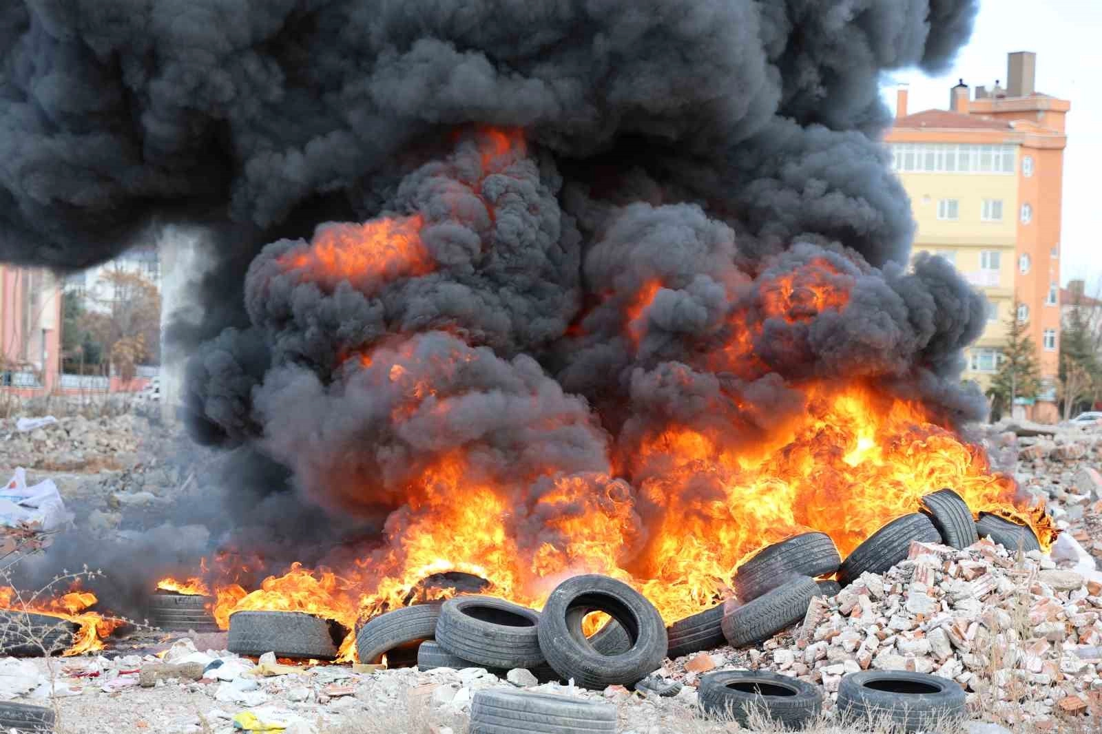Olay, Aksaray'ın eski sanayi sitesinde yaşandı. Edinilen bilgiye göre, sanayi sitesindeki araziye kimliği belirsiz kişi ya da kişilerce getirilen eski araç lastikleri ateşe verildi. Yanmaya başlayan lastikler adeta alev topuna dönerken, gökyüzüne siyah duman yükseldi. Yangını fark eden devriye görevindeki polis ekipleri çevrede güvenlik önlemi alarak olay yerine itfaiye ekiplerini çağırdı. İtfaiye ekipleri yangına müdahale ederek kısa sürede söndürdü.