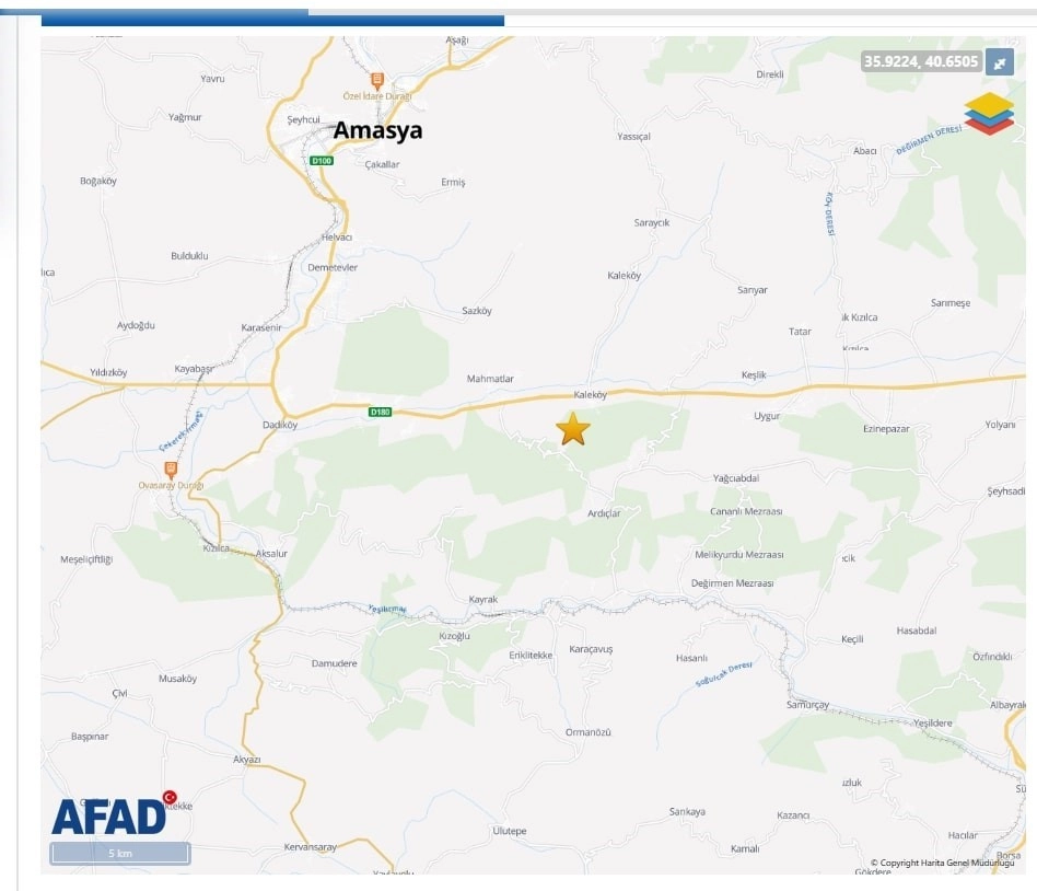 Afet ve Acil Durum Yönetimi Başkanlığı (AFAD) verilerine göre, bugün saat 13.17'de merkez üssü Amasya Merkez olan 3.2 büyüklüğünde bir deprem kaydedildi. Depremin yerin 7.02 kilometre derinliğinde meydana geldiği bildirildi.