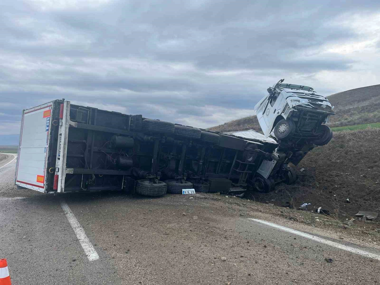 Amasya'da kontrolden çıkan tır yola devrildi. Tırın kupası adeta şahlanarak havada asılı kaldı. Yaralanan sürücü sıkıştığı yerden merdiven yardımıyla kurtarıldı.