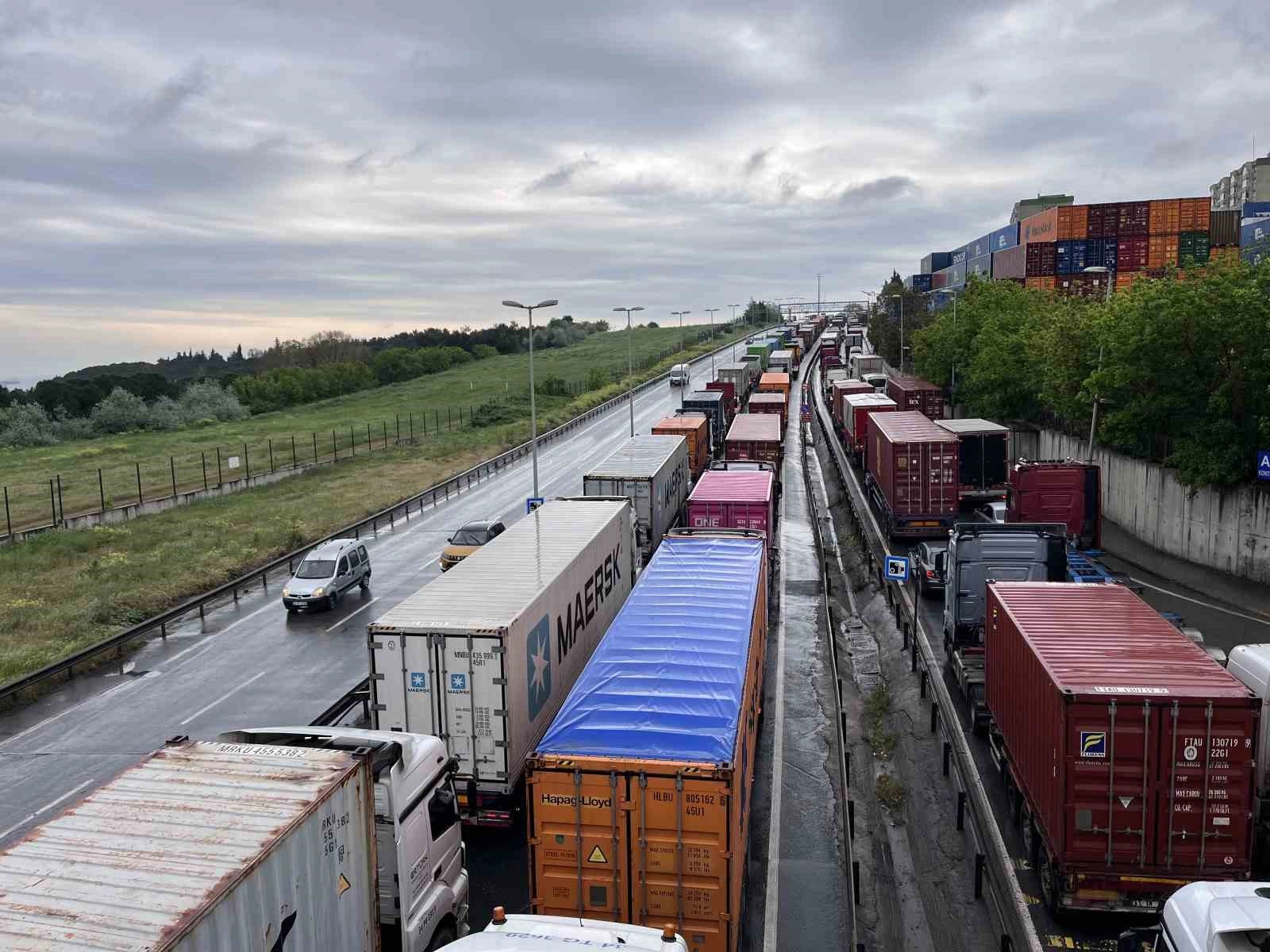 Ambarlı Liman Yolu'nda akşam saatlerinde metrelerce tır kuyruğu oluştu. Tır sürücüleri korna çalarak duruma tepki gösterirken, oluşan kuyruk dron ile havadan görüntülendi.