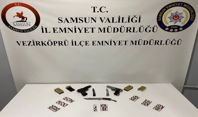 Samsun'un Vezirköprü ilçesinde yol kontrol uygulaması sırasında araçlarında uyuşturucu ve ruhsatsız tabanca bulunan 4 kişi hakkında adli işlem başlatıldı