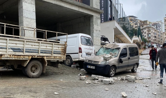 Şehit Dursun Acar Caddesi'ndeki bir bina inşaatından, park halindeki 34 RM 870 plakalı otomobilin üzerine tuğlalar düştü.
