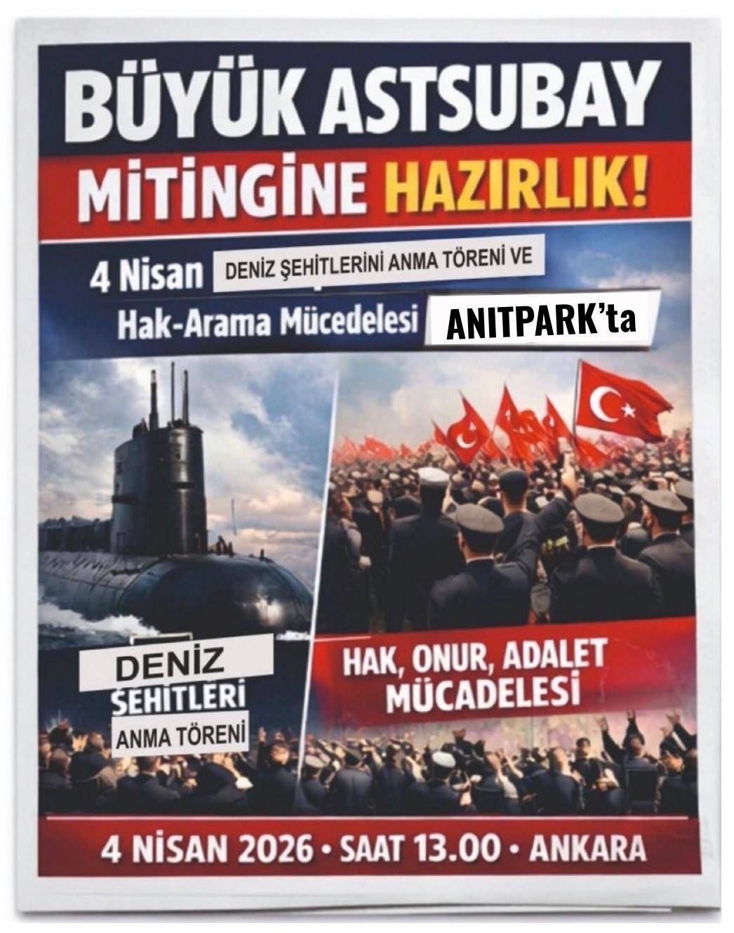 Program saat 13.00’te başlayacak etkinlik kapsamında emekli astsubaylar önce Türk denizcilik tarihinin acı hatıralarını taşıyan deniz şehitlerini anacak, ardından emeklilikte ve görevde yaşadıkları özlük hakları sorunlarını dile getirecekleri “Büyük Emekli Astsubay Mitingi” ile taleplerini kamuoyu ile paylaşacak.