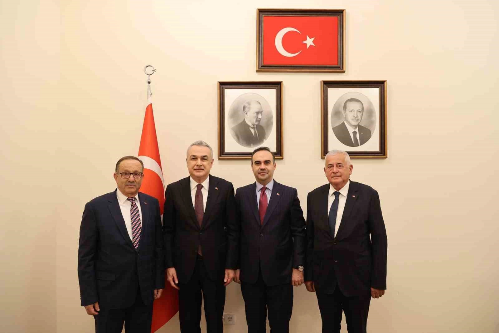 Aydın Ticaret Borsası Meclis Başkanı A. Bahri Erdel ve Yönetim Kurulu Başkan Yardımcısı Cengiz Ülgen, Aydın Milletvekili Mustafa Savaş ile birlikte Sanayi ve Teknoloji Bakanı Mehmet Fatih Kacır'ı makamında ziyaret etti.
