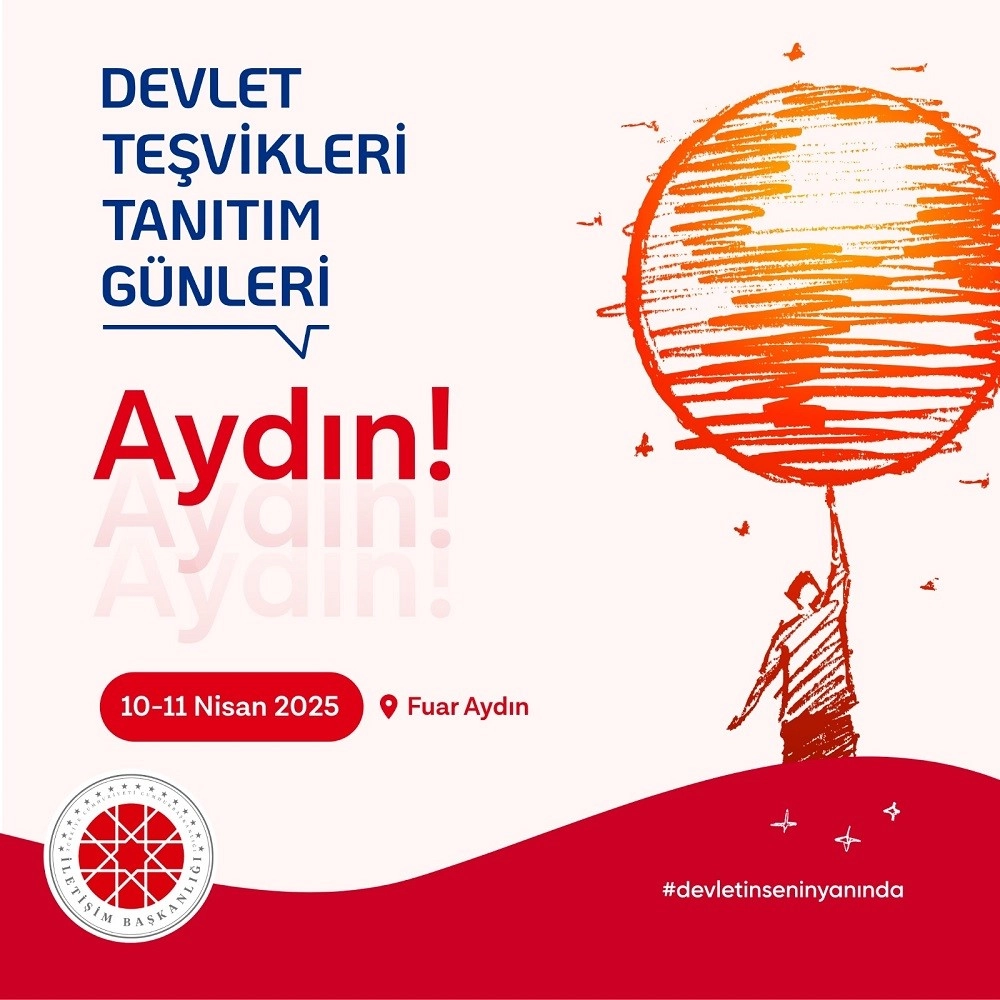 Cumhurbaşkanlığı İletişim Başkanlığı tarafından organize edilen Devlet Teşvikleri Tanıtım Günleri etkinliği 10-11 Nisan 2025 tarihleri arasında Fuar Aydın'da gerçekleştirilecek.