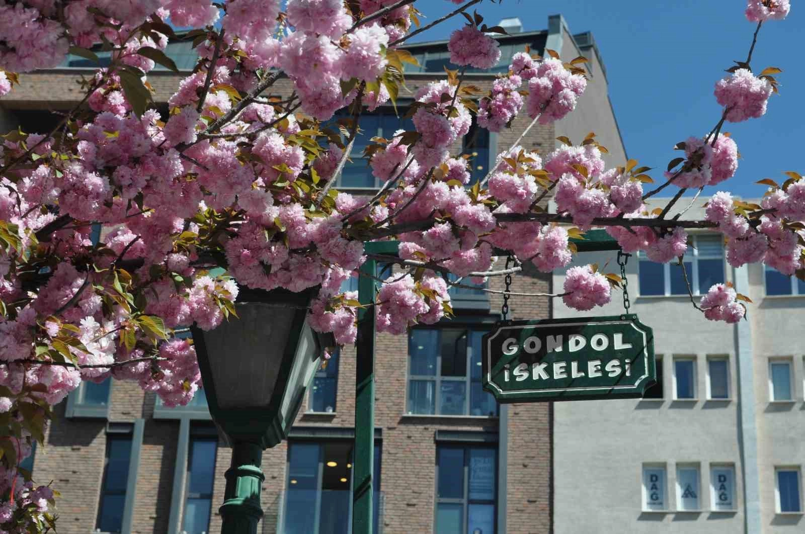 Eskişehir'de pembe renkte çiçekler açan ağaçlar ve Porsuk Nehri'nin kıyısındaki mor renkli asmalar, adeta kartpostallık bir görüntü oluşturdu.