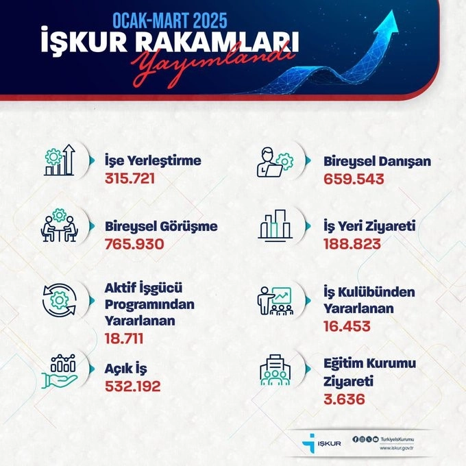 "Ocak-Mart aylarında toplam 315 bin 721 işe yerleştirmeye aracılık ettik. İŞKUR aracılığıyla istihdam destekleyici uygulamalarımıza devam ediyoruz. Ocak-Mart aylarında toplam 315 bin 721 işe yerleştirmeye aracılık ettik. 765 bin 930 bireysel görüşme ve 188 bin 823 iş yeri ziyareti gerçekleştirdik. 532 bin 192 açık iş (işveren tarafından talep edilen-ihtiyaç duyulan eleman) tespit ettik. Ulusal İstihdam Stratejimiz ve Orta Vadeli Program hedeflerimiz doğrultusunda işgücü piyasalarının güncel ihtiyaçlarının karşılanması ve istihdamımızın korunarak artırılması için çalışmalarımızı sürdüreceğiz."