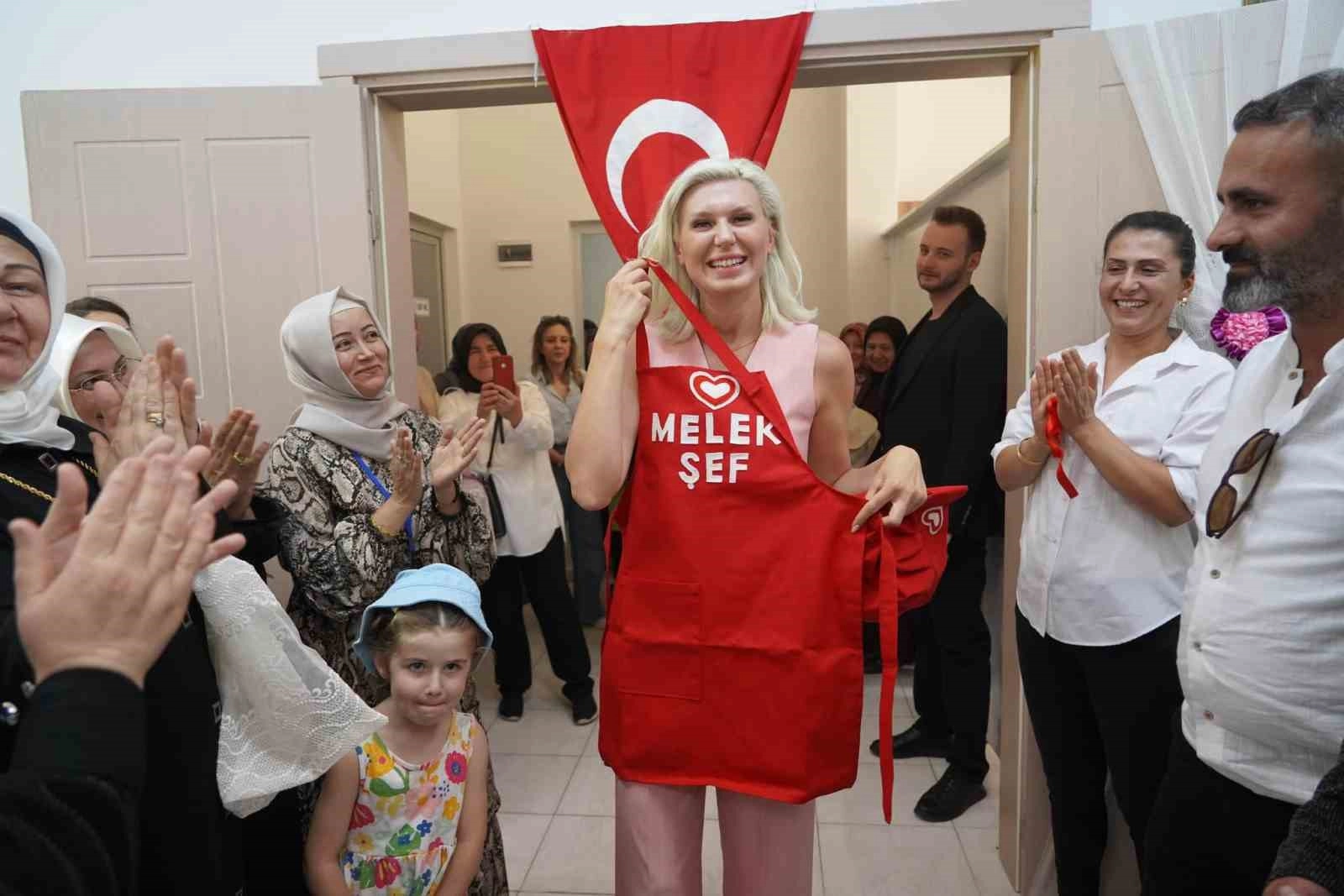 Bilecik Belediye Başkanı Melek Mızrak Subaşı, dikiş kursu sergisinin açılışında hediye edilen 'Melek Şef' yazılı önlüğü taktı.