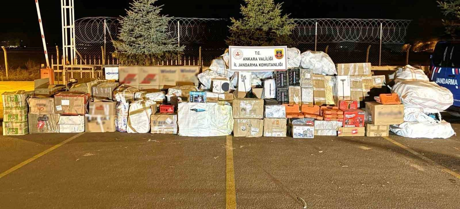 Ankara İl Jandarma Komutanlığınca kaçakçılığın önlenmesine yönelik sürdürülen çalışmalar kapsamında gümrük kaçakçılığı yaptığı tespit edilen 3 şahıs düzenlenen operasyon ile Ankara' da yakalandı. Kaçakçılık ve Organize Suçlarla Mücadele (KOM) Şube Müdürlüğü ekipleri tarafından yapılan uzun süreli takip sonucunda D.Ç., K.K. ve E.D. isimli şüphelilerin gümrük kaçağı olduğu tespit edilen ürünleri satışa sunacağı bilgisine ulaşılmıştır. KOM Şube Müdürlüğü ve Kahramankazan İlçe Jandarma Komutanlığı ekipleri tarafından düzenlenen operasyonda şüphelilerin kullandığı tırda yapılan arama sonucunda piyasa değeri yaklaşık 6 milyon 200 bin TL olan;240 bin adet makaron, 671 paket sigara, 500 adet elektronik sigara, 492 kg tütün, 215 paket nargile tütünü, 4 bin 52 adet giyim ve aksesuar malzemesi, 3 bin 717 paket gıda malzemesi, 560 adet elektronik malzeme, 559 adet çakmak, 64 adet hırdavat malzemesi ele geçirildi.