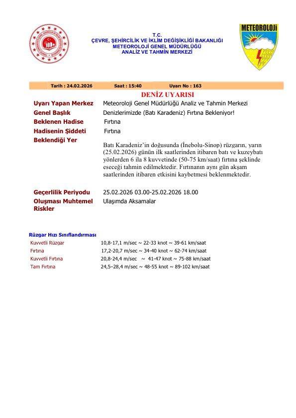Meteoroloji Genel Müdürlüğü Analiz ve Tahmin Merkezi, Batı Karadeniz’in doğusunda fırtına beklendiğini duyurdu. Yapılan son değerlendirmelere göre, İnebolu-Sinop açıklarında rüzgarın 25 Şubat 2026 Çarşamba günü ilk saatlerden itibaren batı ve kuzeybatı yönlerden 6 ila 8 kuvvetinde (50-75 km/saat) fırtına şeklinde eseceği tahmin ediliyor.