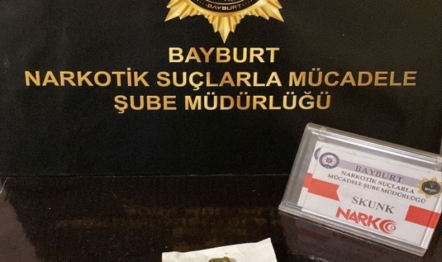 Bayburt'ta polisin durdurduğu bir araçta adli arama yapıldı, araçta bulunan Ü.Ş isimli şahsın üzerinde bir miktar skunk maddesi bulundu. Şüpheli şahsa uyuşturucu kullanmak suçundan adli işlem uygulandı.