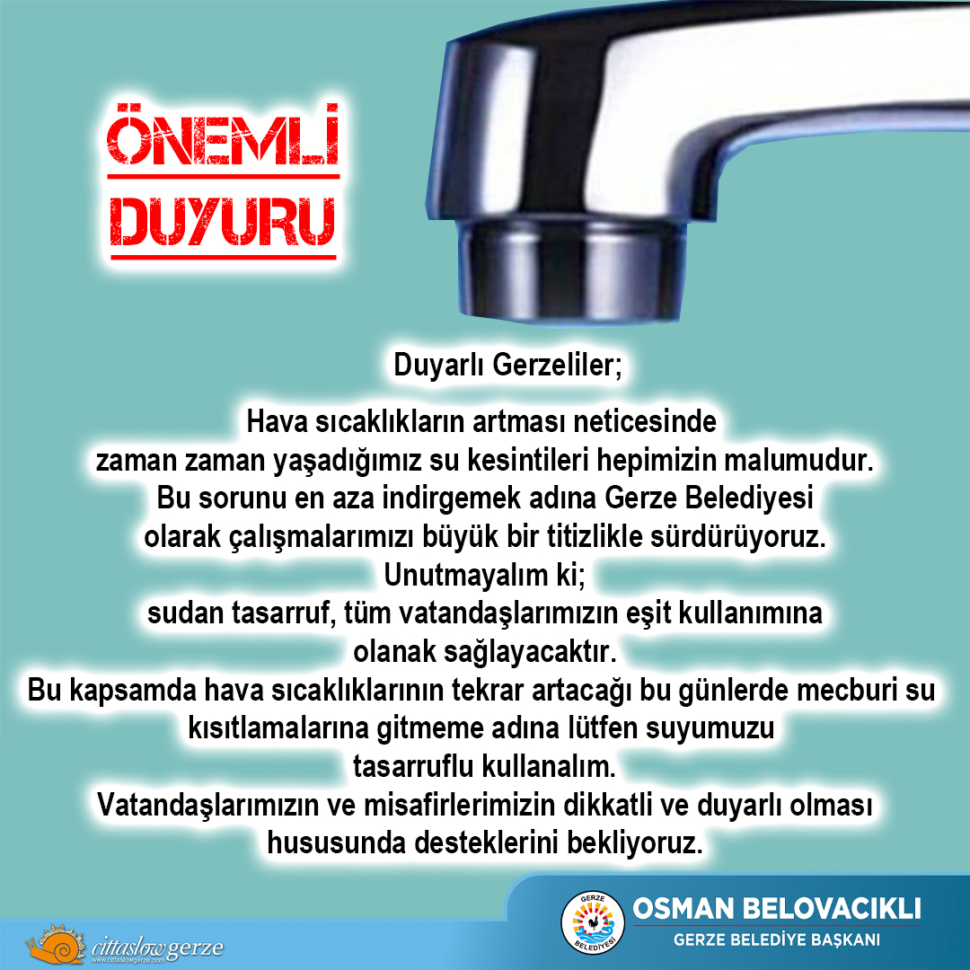 Gerze Belediyesi’nden yapılan açıklamada, “Hava sıcaklıklarının artması neticesinde zaman zaman yaşadığımız su kesintileri hepimizin malumudur. Bu sorunu en aza indirgemek adına Gerze Belediyesi olarak çalışmalarımızı büyük bir titizlikle sürdürüyoruz. Unutmayalım ki sudan tasarruf, tüm vatandaşlarımızın eşit kullanımına olanak sağlayacaktır. Bu kapsamda hava sıcaklıklarının tekrar artacağı bu günlerde mecburi su kısıtlamalarına gitmeme adına lütfen suyumuzu tasarruflu kullanalım. Vatandaşlarımızın ve misafirlerimizin dikkatli ve duyarlı olması hususunda desteklerinizi bekliyoruz.” İfadelerine yer verildi.