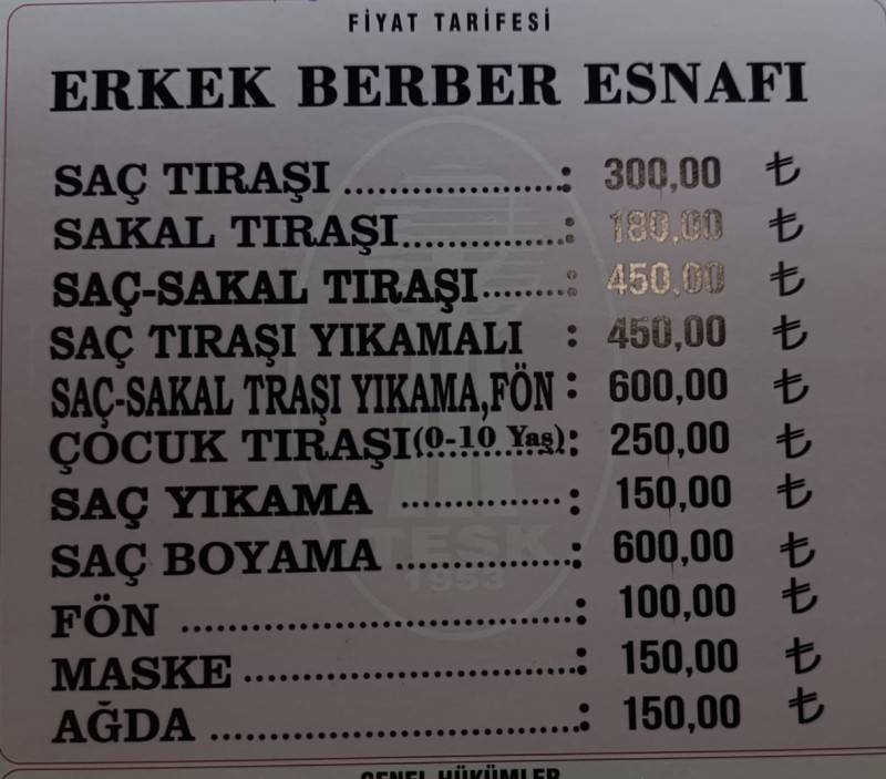 Yapılan güncelleme ile birlikte berber hizmetlerinde uygulanan eski fiyatlar önemli ölçüde artırıldı. Buna göre saç tıraşı 120 TL’den 300 TL’ye, sakal tıraşı 80 TL’den 180 TL’ye, saç–sakal tıraşı ise 200 TL’den 450 TL’ye yükseltildi.