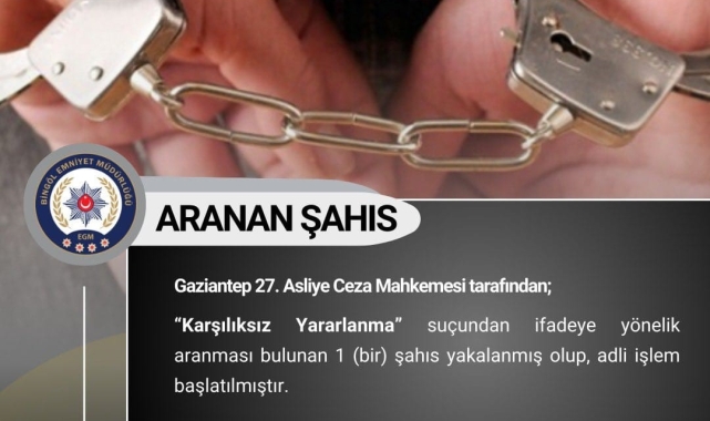 Bingöl'de huzur ve güvenliğin sağlanması için İl Emniyet Müdürlüğü ekipleri, gece gündüz demeden çalışmalarını sürdürüyor. Bu çerçevede ekiplerce yapılan çalışmada, çeşitli suçlardan aranması bulunan 3 şüpheli yakalanarak gözaltına alındı. Şüpheliler hakkında adli işlemlerin sürdüğü bildirildi.