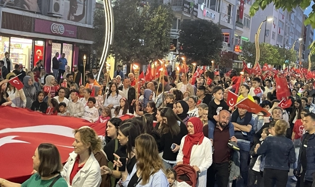Ellerinde Türk bayrakları ve fener olan çok sayıda kişi, Hükümet Meydanı'nda toplandı. Gruptakiler daha sonra belediye bandosu eşliğinde Karaçayır Mahallesi'nde bulunan konser alanına kadar yürüdü.