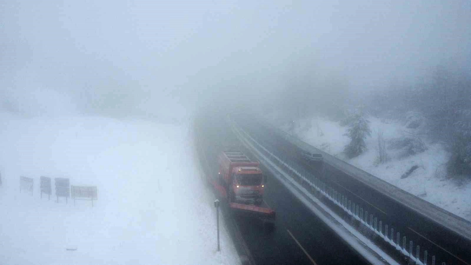 Bolu Dağı'nda kar yağışı ve sis etkili oluyor. Görüş mesafesinin 20 metreye düştüğü yol, havadan görüntülendi.