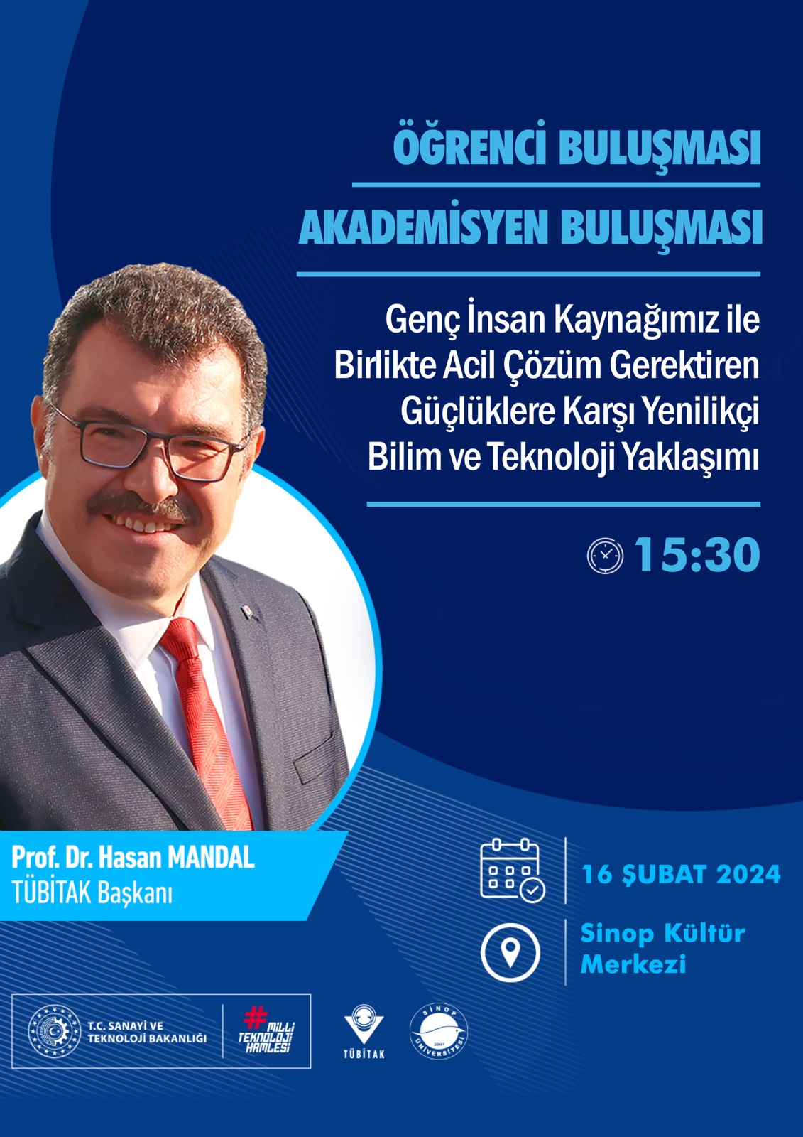 16 Şubat 2024 Cuma günü saat 15.30'da Sinop Kültür Merkezi'nde, Genç insan Kaynağımız ile Birlikte Acil Çözüm Gerektiren Güçlüklere Karşı Yenilikçi Bilim ve Teknoloji Yaklaşımı” konulu düzenlenecek konferansa, TÜBİTAK Başkanı Prof. Dr. Hasan Mandal da katılım sağlayacak.