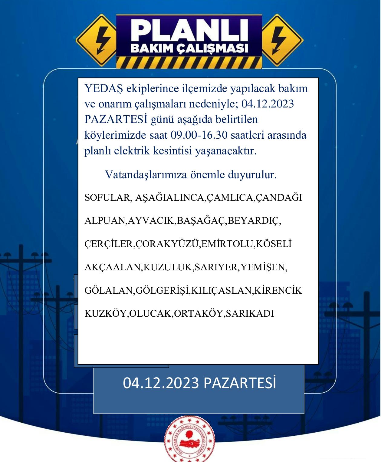 YEDAŞ ekiplerince Durağan’da yapılacak bakım ve onarım çalışmaları nedeniyle, 4 Aralık Pazartesi Günü saat 09.00-16.30 saatleri arasında belirtilen köylerde planlı elektrik kesintisi yapılacağı bildirildi.