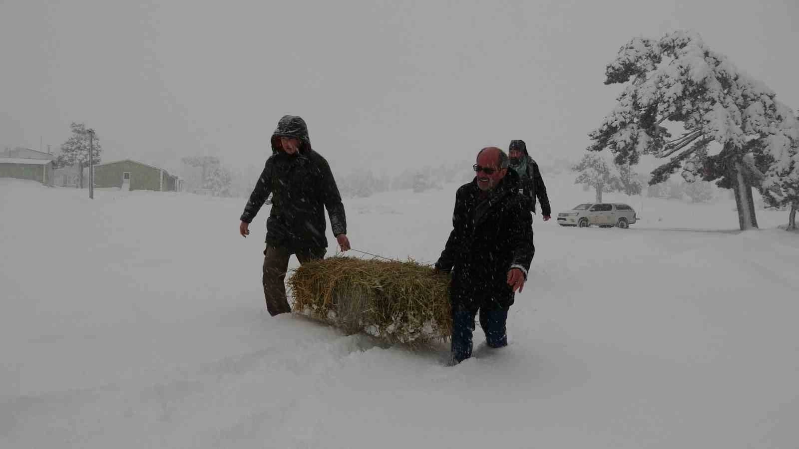 Burdur'da yoğun kar yağışının etkili olduğu ve kar kalınlığının yarım metreyi bulduğu Eşeler Yaylası'nda Doğa Koruma ve Milli Parklar (DKMP) ekipleri, yaban hayvanları ve kızıl geyikler için yem bırakıyor.