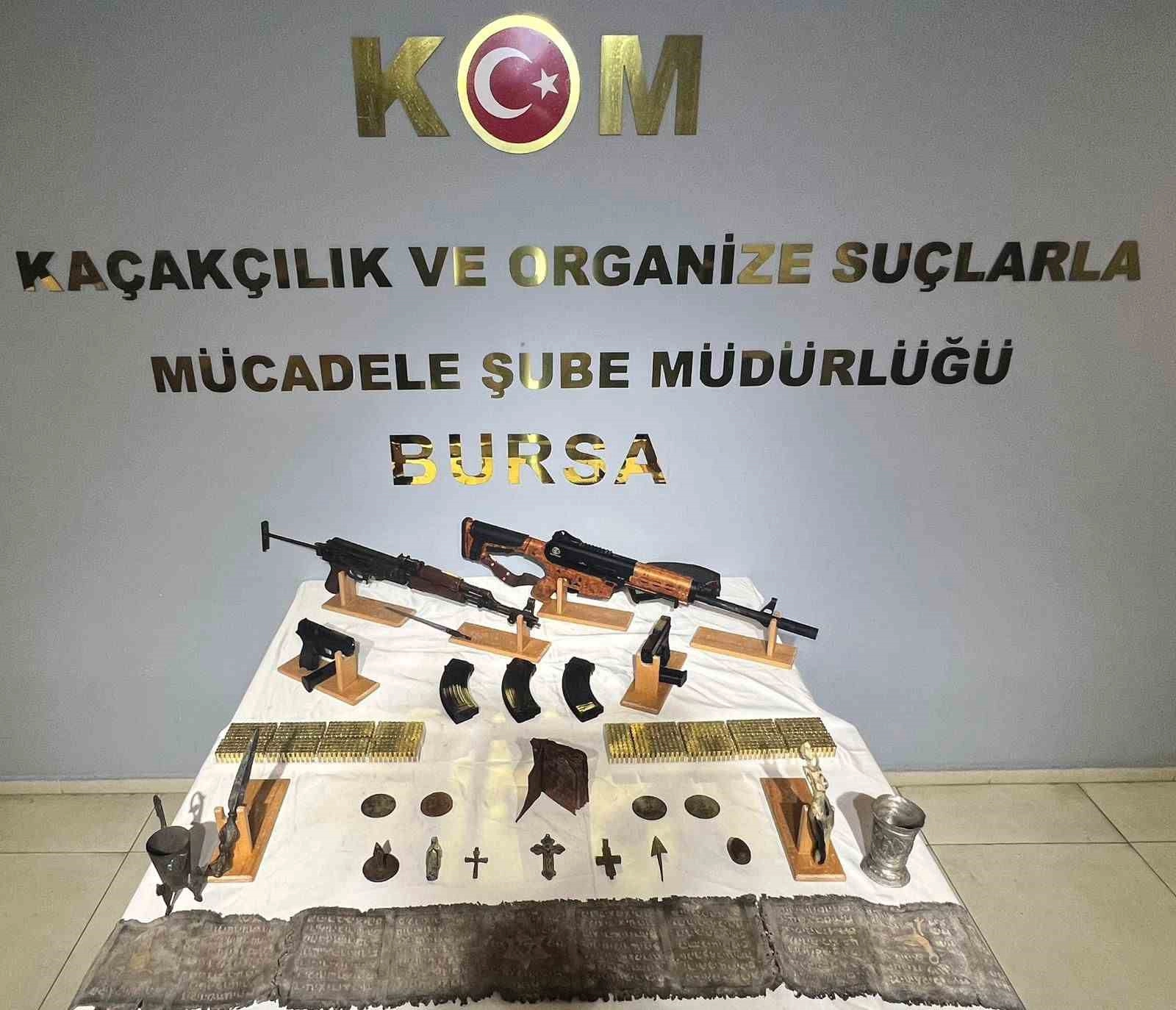 Bursa'nın Yıldırım ilçesinde silah imal edip ticareti yapıp, aynı zamanda tarihi eser kaçaklığı yapan G.A. Ö.A. M.B. ve F.B. isimli şahısların adreslerine Bursa İl Emniyet Müdürlüğü Kaçakçılık ve Organize Suçlarla Mücadele Şube Müdürlüğü ekiplerince eş zamanlı operasyon düzenlendi. Yapılan operasyonda 4 şüpheli yakalanırken, Bursa Cumhuriyet Başsavcılığı talimatı ile adreste arama yapıldı. Yapılan aramada bir adet AK-47, 1 adet ruhsatsız av tüfeği, 28 adet AK-47 fişeği, bin 68 adet farklı çaplarda fişek, 2 adet ruhsatsız tabanca, 14 adet metal obje, 1 adet kitap ve içerisinde 2 adet deri obje, bir adet heykel, bir adet parşömen, 161 sayfadan oluşan üzerinde arapça yazılar bulunan kitap ele geçirildi. Polis ekiplerince gözaltına alınan 4 şahıstan işlemleri tamamlanan G.A. ve Ö.D. sevk edildiği adliyede çıkarıldığı mahkemece tutuklanırken, 2 şüphelinin ise emniyetteki işlemleri devam ediyor.