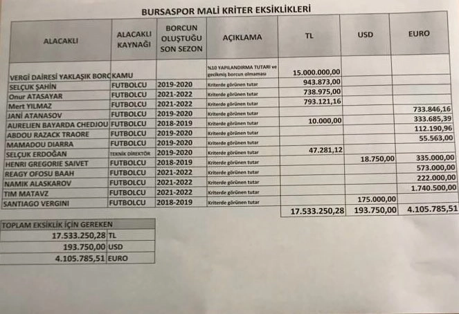 Bursaspor Kulübü, mali kriter eksikleri isimli bir tablo yayımlayarak, "Geçmiş dönemlerde görev yapan yönetimler, yapılması gerekenleri zamanında yapsalardı bugün bunlar yaşanmayacaktı. Bu zavallılardan bazıları utanmadan sıkılmadan yönetime aday olmayı hayal ediyorlar" açıklamasında bulundu.