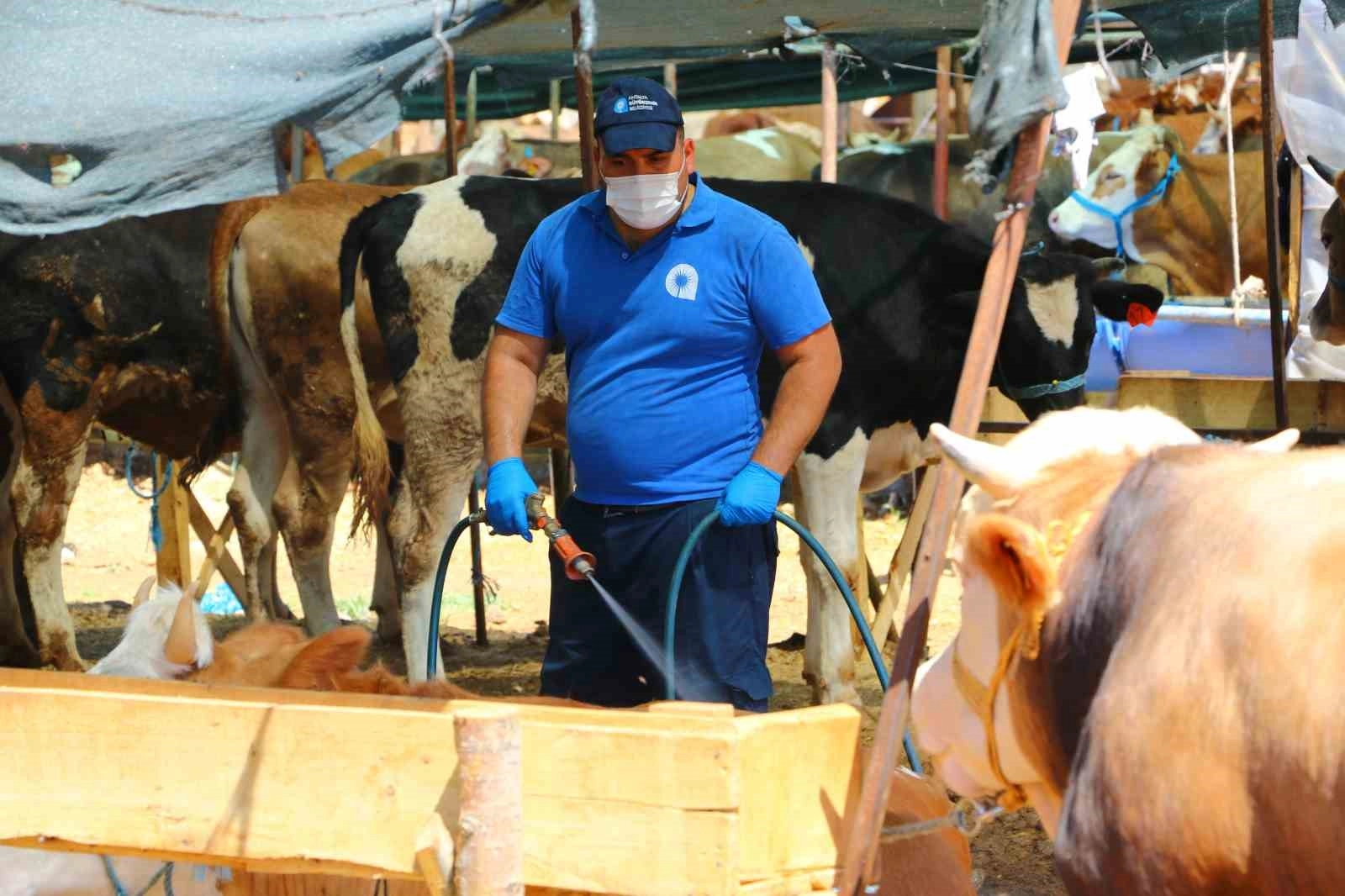 Antalya Büyükşehir Belediyesi 19 ilçede kurbanlık satış alanlarında periyodik ilaçlama uygulaması yapıyor. Kurban Bayramı boyunca ekipler kesim noktalarında da hijyen nöbetinde olacak.