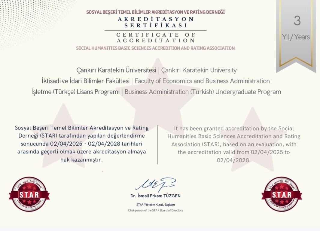 Çankırı Karatekin Üniversitesi İktisadi ve İdari Bilimler Fakültesi bünyesinde faaliyet gösteren İşletme Bölümü, eğitim kalitesini bir kez daha tescilledi. Sosyal Beşeri Temel Bilimler Akreditasyon ve Rating Derneği (STAR) tarafından yapılan değerlendirme sonucunda bölüm, üç yıl süreyle geçerli akreditasyon belgesi almaya hak kazandı.