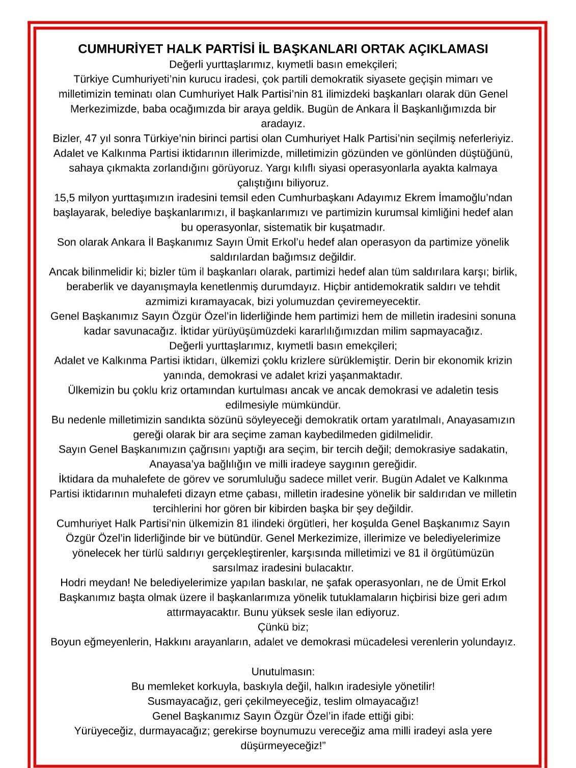 Ortak metinde, Cumhurbaşkanı adayı Ekrem İmamoğlu başta olmak üzere belediye başkanları, il başkanları ve partiye yönelik operasyonların “sistematik bir kuşatma” olduğu iddia edildi. Ankara İl Başkanı Ümit Erkol’a yönelik son gelişmelerin de bu sürecin bir parçası olduğu kaydedildi.