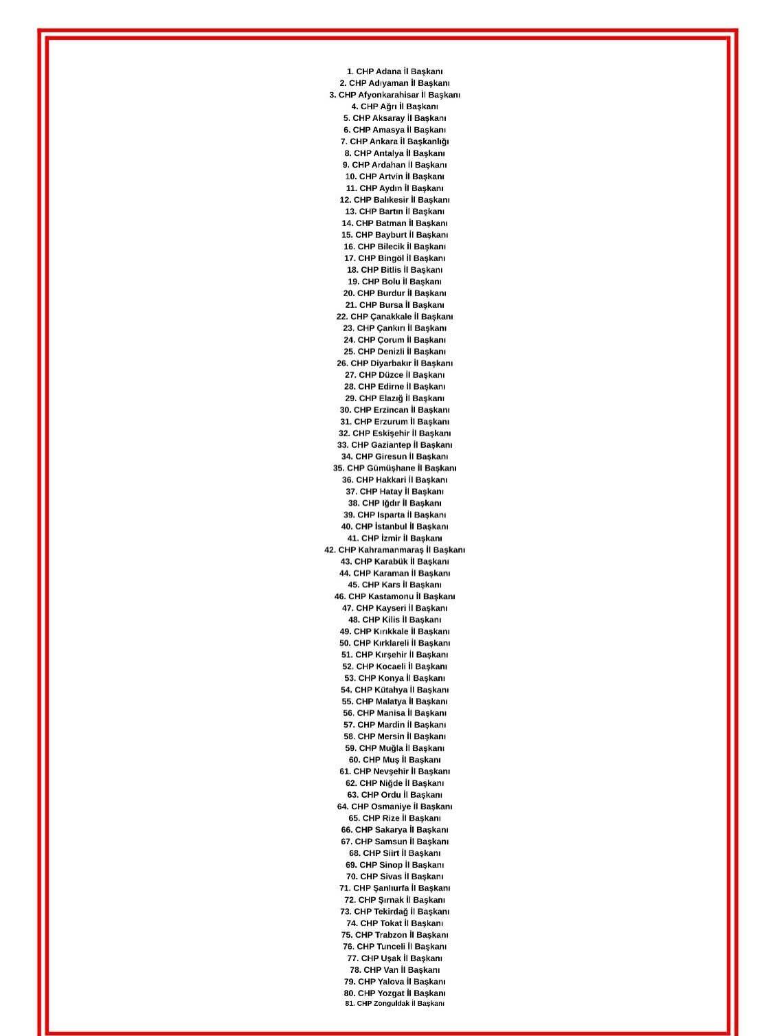CHP il başkanları, partinin 47 yıl sonra Türkiye’nin birinci partisi konumuna geldiğini ifade ederek, sahadaki gözlemlerine göre iktidar partisi Adalet ve Kalkınma Partisi’nin (AK Parti) toplum nezdinde destek kaybettiğini savundu. Açıklamada, iktidarın yargı üzerinden siyasi operasyonlarla ayakta kalmaya çalıştığı öne sürüldü.
