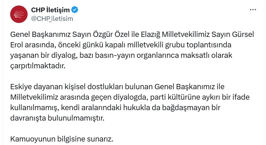 Yaşanan olayın ardından CHP İletişim Merkezi, sosyal medya hesabından konuya ilişkin açıklama yaptı. Açıklamada, "Genel Başkanımız Özgür Özel ile Elazığ Milletvekilimiz Gürsel Erol arasında, önceki günkü kapalı milletvekili grubu toplantısında yaşanan bir diyalog, bazı basın-yayın organlarınca maksatlı olarak çarpıtılmaktadır. Eskiye dayanan kişisel dostlukları bulunan Genel Başkanımız ile milletvekilimiz arasında geçen diyalogda, parti kültürüne aykırı bir ifade kullanılmamış, kendi aralarındaki hukukla da bağdaşmayan bir davranışta bulunulmamıştır" denildi.