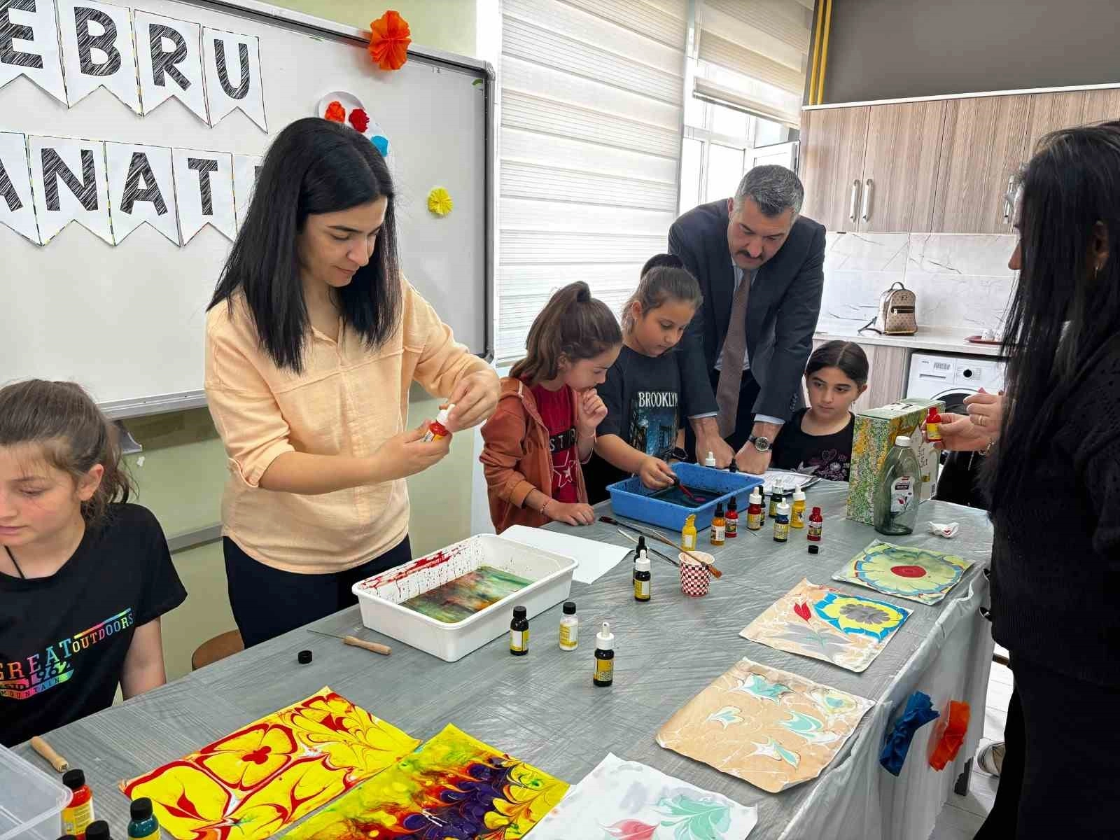 Kırşehir'in Çiçekdağı ilçesinde çocukların beceri gelişimlerini arttırmak amacıyla ebru sanatı etkinliği düzenlendi.