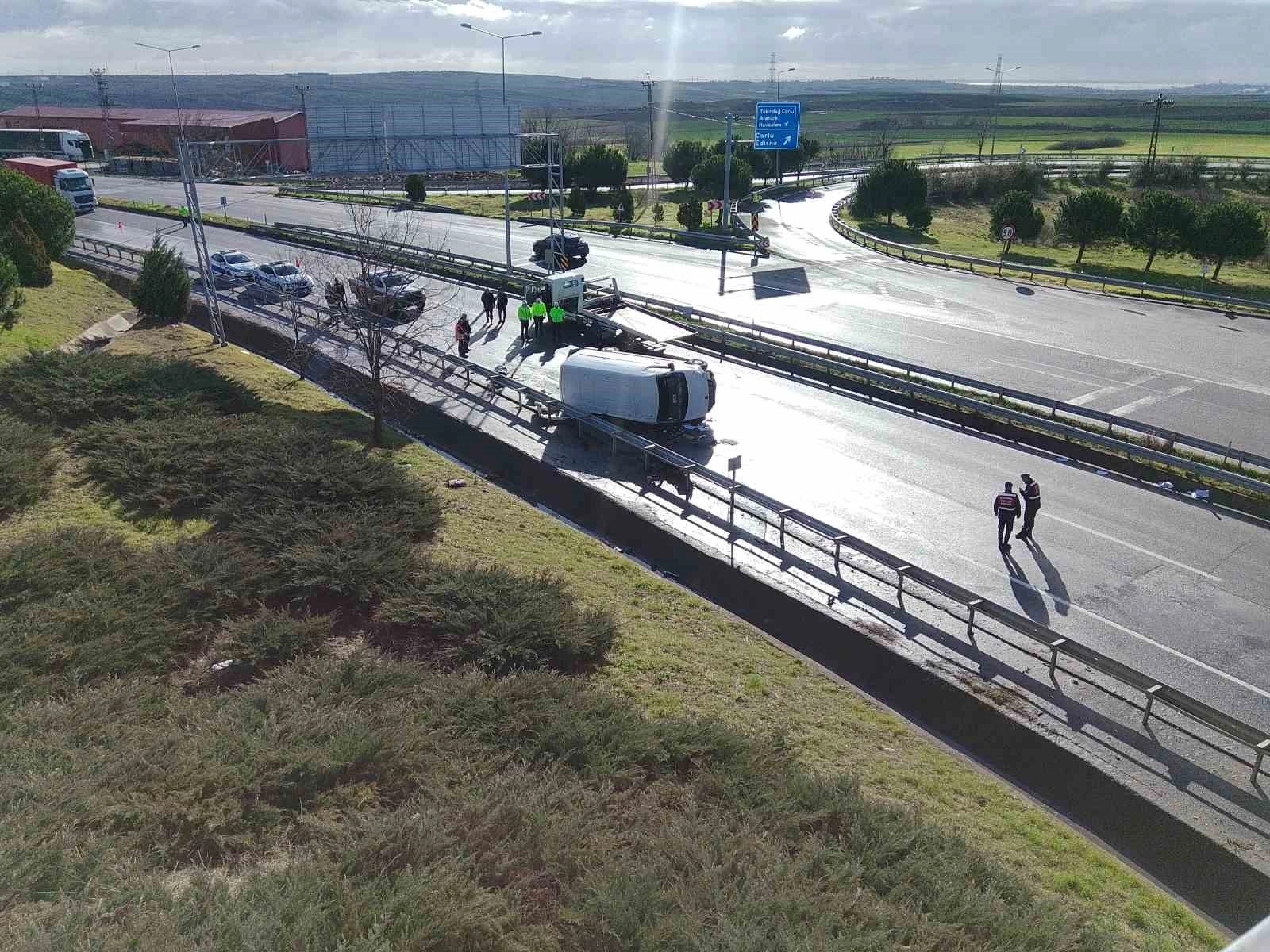 Kaza, İstanbul yolu üzeri Marmara Ereğlisi yol ayrımı mevkiinde meydana geldi. Silivri Değirmenköy istikametinden Çorlu istikametine seyreden Tuğrul Özen idaresindeki 34 RL 9062 plakalı panelvan, refüjdeki bariyerlere çarparak devrildi.
