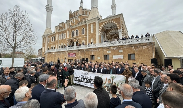 Çorum Filistin Platformunun daveti üzerine Akşemseddin Camisi önünde toplanan vatandaşlar, "Gazze için de bayram olsun" yazılı pankart taşıdı.