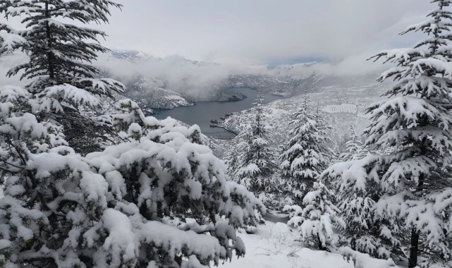 Kızılırmak Nehri üzerine kurulu Obruk Barajı'nın çevresindeki orman da beyaz örtüyle kaplandı.