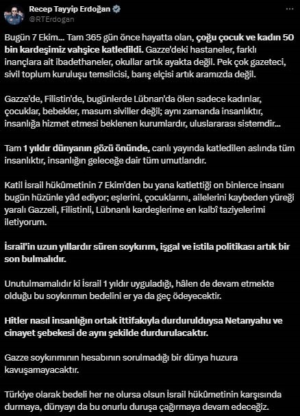 Cumhurbaşkanı Erdoğan, "Katil İsrail hükûmetinin 7 Ekim'den bu yana katlettiği on binlerce insanı bugün hüzünle yâd ediyor; eşlerini, çocuklarını, ailelerini kaybeden yüreği yaralı Gazzeli, Filistinli, Lübnanlı kardeşlerime en kalbî taziyelerimi iletiyorum. İsrail'in uzun yıllardır süren soykırım, işgal ve istila politikası artık bir son bulmalıdır. Unutulmamalıdır ki İsrail 1 yıldır uyguladığı, hâlen de devam etmekte olduğu bu soykırımın bedelini er ya da geç ödeyecektir. Hitler nasıl insanlığın ortak ittifakıyla durdurulduysa Netanyahu ve cinayet şebekesi de aynı şekilde durdurulacaktır. Gazze soykırımının hesabının sorulmadığı bir dünya huzura kavuşamayacaktır. Türkiye olarak bedeli her ne olursa olsun İsrail hükûmetinin karşısında durmaya, dünyayı da bu onurlu duruşa çağırmaya devam edeceğiz" ifadelerini kullandı.
