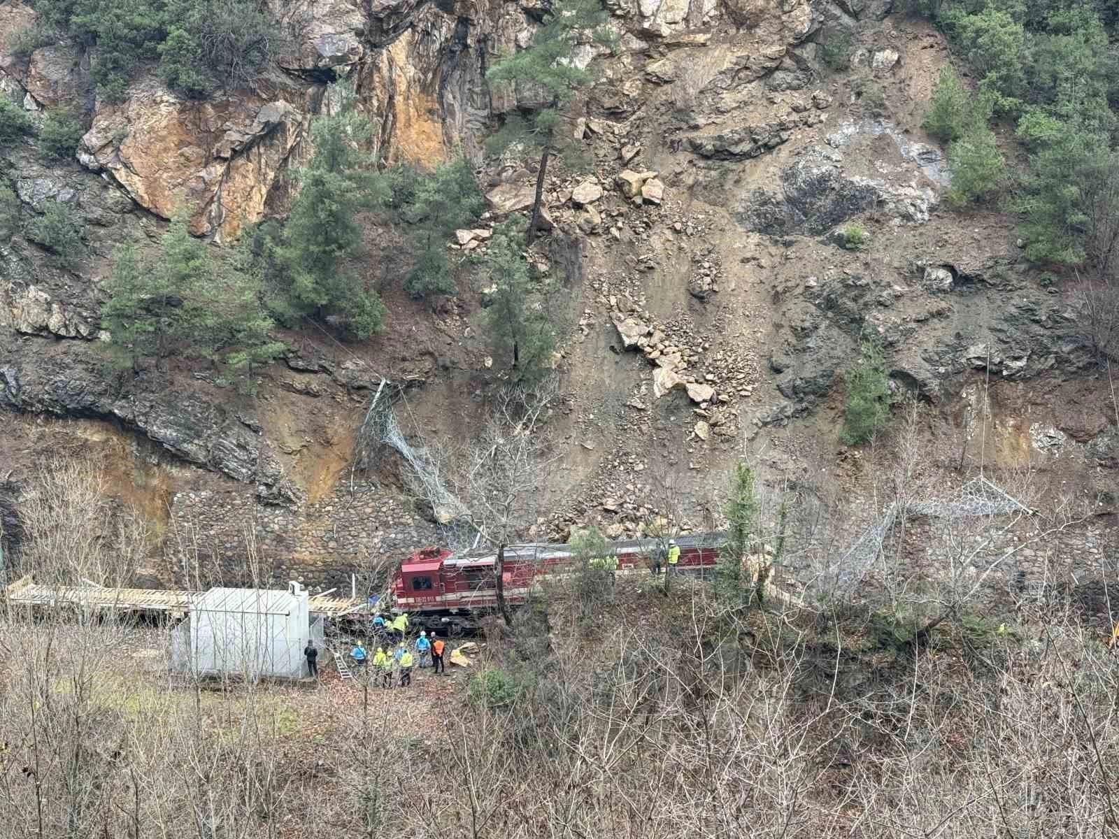 Demir yolunu kapatan kayaları ve raydan çıkan lokomotifi kaldırma çalışmaları sürüyor.