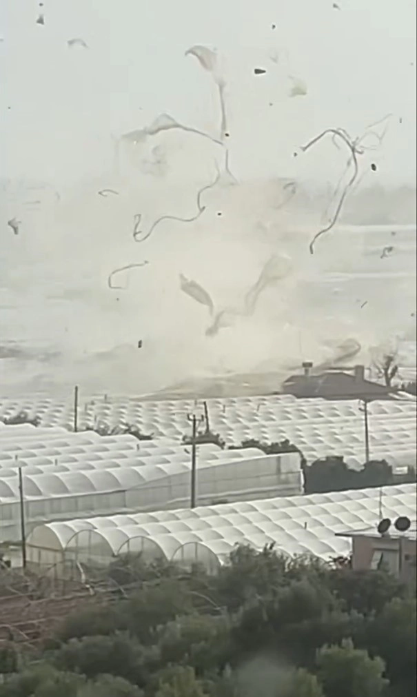 Antalya'nın Demre ilçesinde hortum elektrik direklerini yıktı, naylon seraları yerle bir etti. O anlar cep telefonu kamerasına yansırken, naylonları sökülen seradaki ince bir direğe bağlı Türk bayrağı ise zarar görmedi.