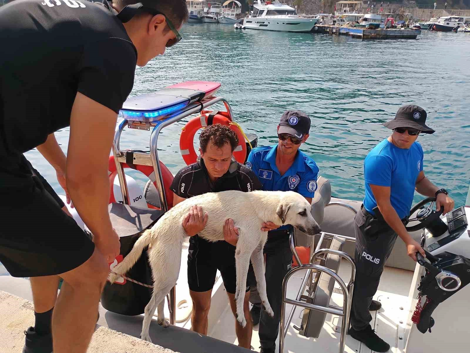 Antalya'da yaklaşık 30 metrelik falezlerin dip noktasında ki kayalık alanda mahsur kalan sokak köpeği deniz polisi tarafından kurtarıldı.