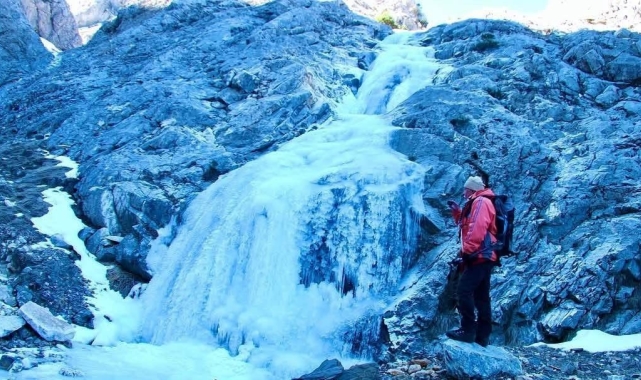 Denizli'de aşırı soğuk hava nedeniyle yüksek kesimlerdeki şelaleler buz tuttu.