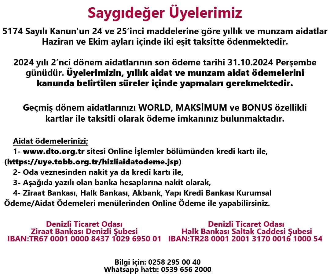 DENİZLİ (İHA) – Denizli Ticaret Odası (DTO), üyelerine 2024 yılı ikinci dönem aidatlarının son ödeme tarihinin 31 Ekim 2024 Perşembe günü olduğunu hatırlattı.