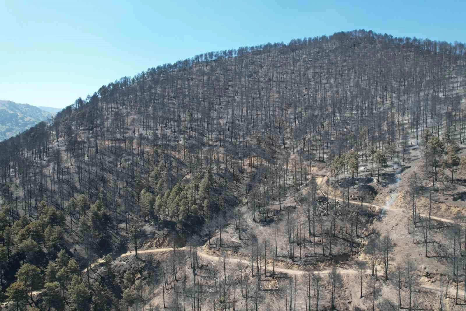Orman yangını sonucu çalışmaların tamamlandığı orman sahası İhlas Haber Ajansı (İHA) dronu ile havadan görüntülendi. Yanan onlarca hektarlık alan siyaha büründüğü görüldü. Görüntülerde içler acısı manzara oluşurken, alevlerden dolayı yanan ağaçlar simsiyah görüntü oluşturdu.