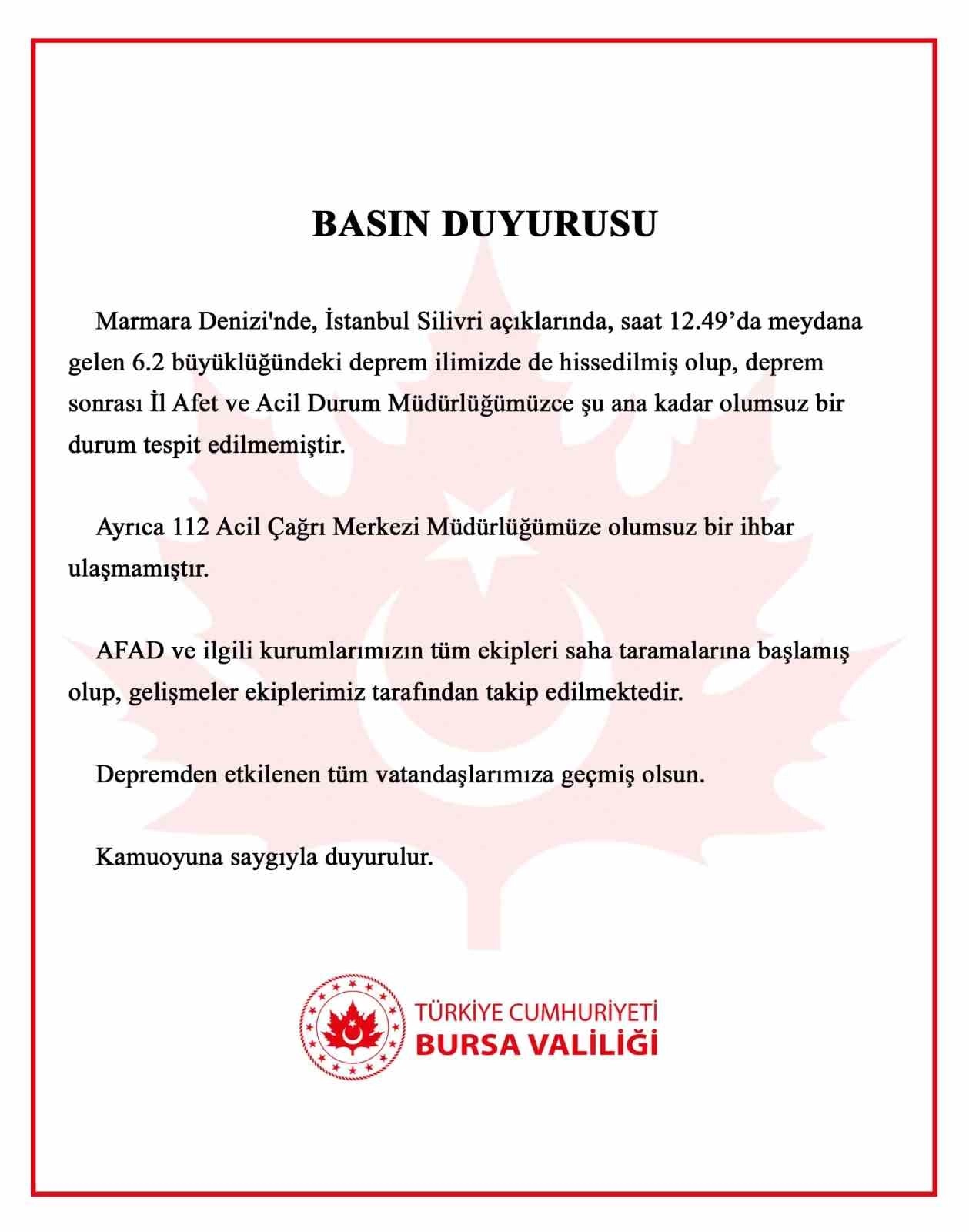Bursa Valiliği'nden yapılan açıklamada, "Marmara Denizi'nde, İstanbul Silivri açıklarında, saat 12.49'da meydana gelen 6.2 büyüklüğündeki deprem ilimizde de hissedilmiş olup, deprem sonrası İl Afet ve Acil Durum Müdürlüğümüzce şu ana kadar olumsuz bir durum tespit edilmemiştir. Ayrıca 112 Acil Çağrı Merkezi Müdürlüğümüze olumsuz bir ihbar ulaşmamıştır. AFAD ve ilgili kurumlarımızın tüm ekipleri saha taramalarına başlamış olup, gelişmeler ekiplerimiz tarafından takip edilmektedir. Depremden etkilenen tüm vatandaşlarımıza geçmiş olsun. Kamuoyuna saygıyla duyurulur" denildi.